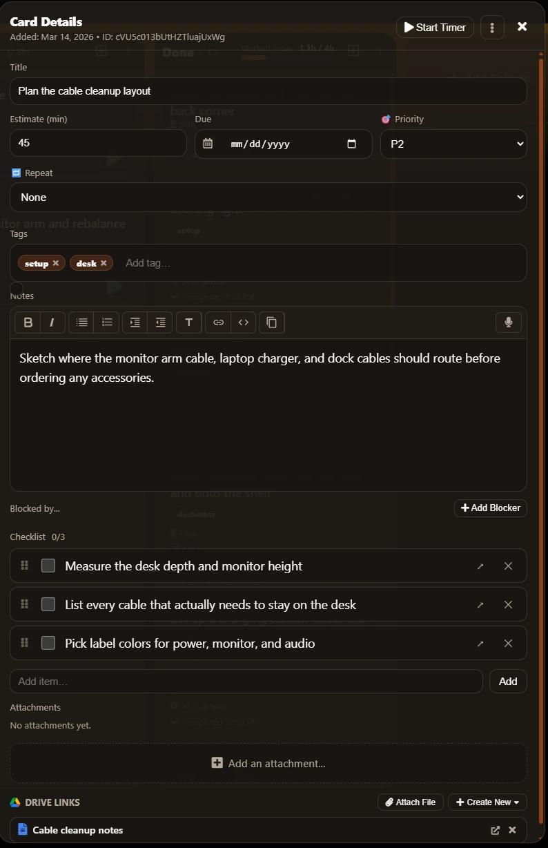 Built-in timing, daily limits, Unified Day planning, work logs, PiP focus, and Google-native document context make it more than a board.