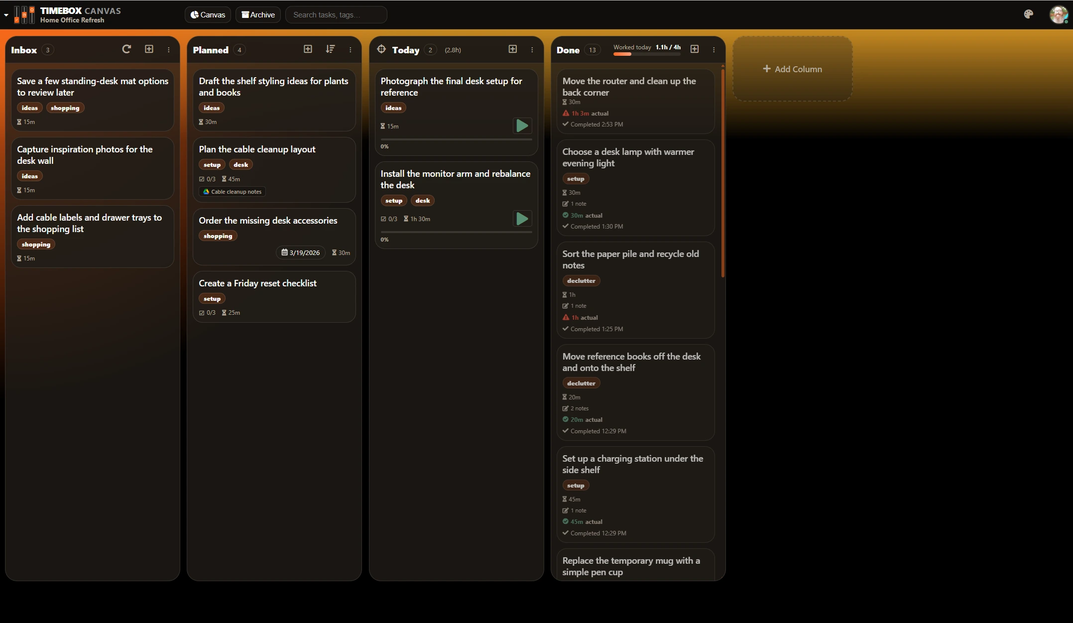 Timebox Canvas is strongest when you want a simpler, more personal execution system. It removes the complexity of team-heavy software and keeps the tools that matter for actually getting your work done, including the guardrails and automation that keep cards consistent as they move.