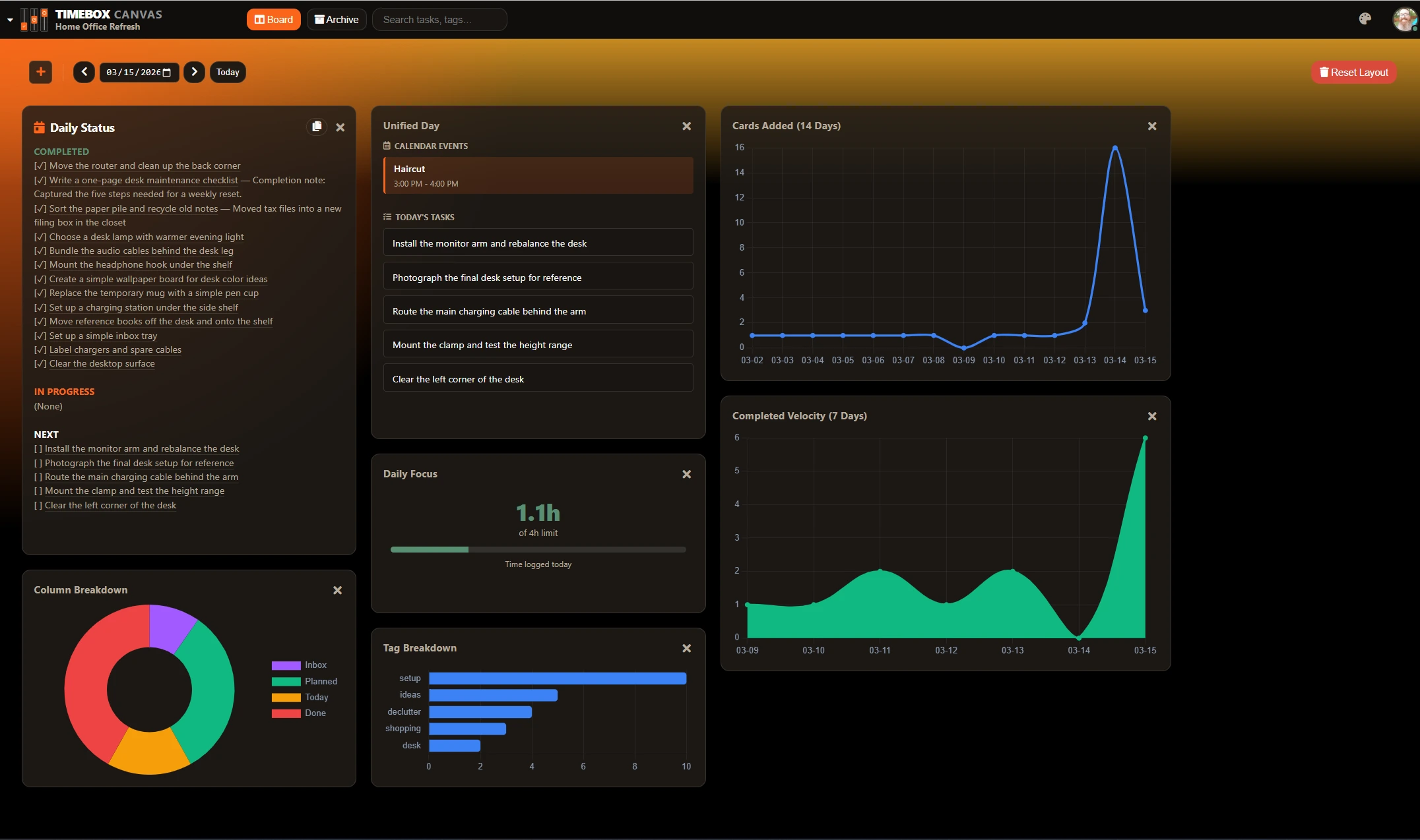 Dashboard widgets help you review focus, deadlines, velocity, and tag spread, and the board can be exported whenever you want.